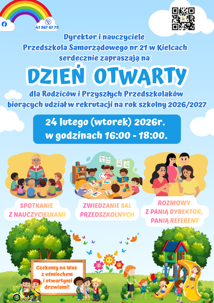 Dyrektor i nauczyciele Przedszkola Samorządowego nr 21 w Kielcach serdecznie zapraszają na DZIEŃ OTWARTY dla Rodziców i Przyszłych Przedszkolaków biorących udział w rekrutacji na rok szkolny 2026/2027