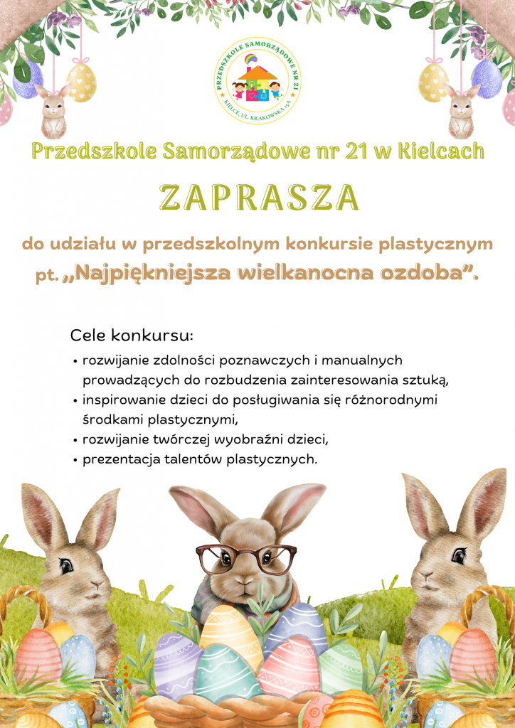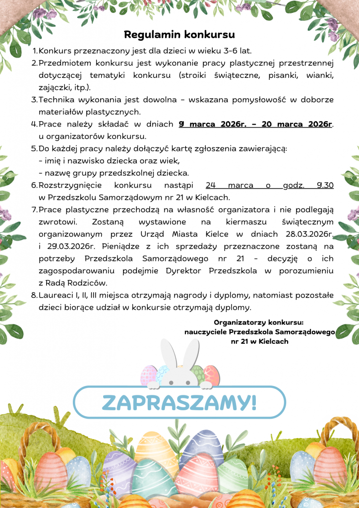 Zapraszamy dzieci i rodziców do udziału w konkursie plastycznym pt. „Najpiękniejsza wielkanocna ozdoba” organizowanym na terenie naszego przedszkola!Więcej informacji na poniższych zdjęciach.