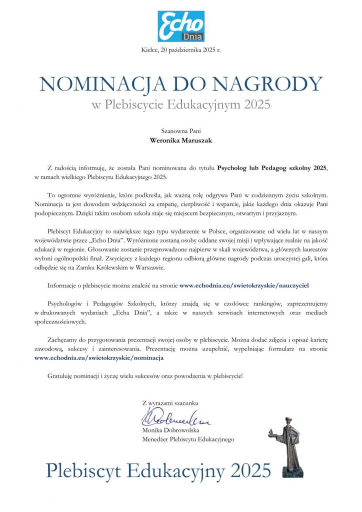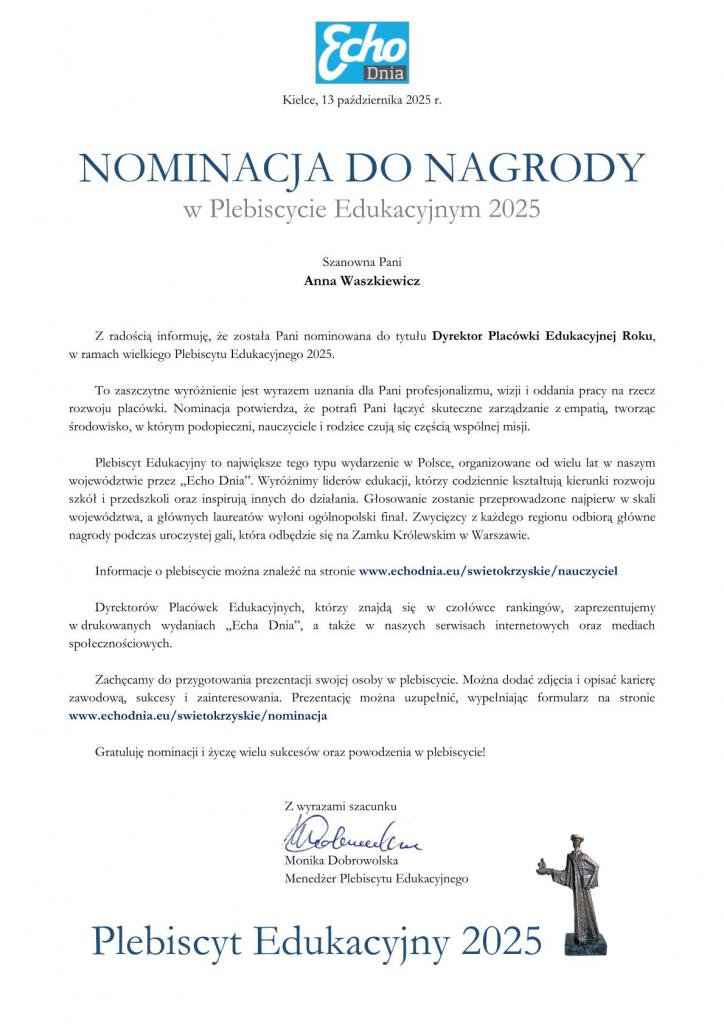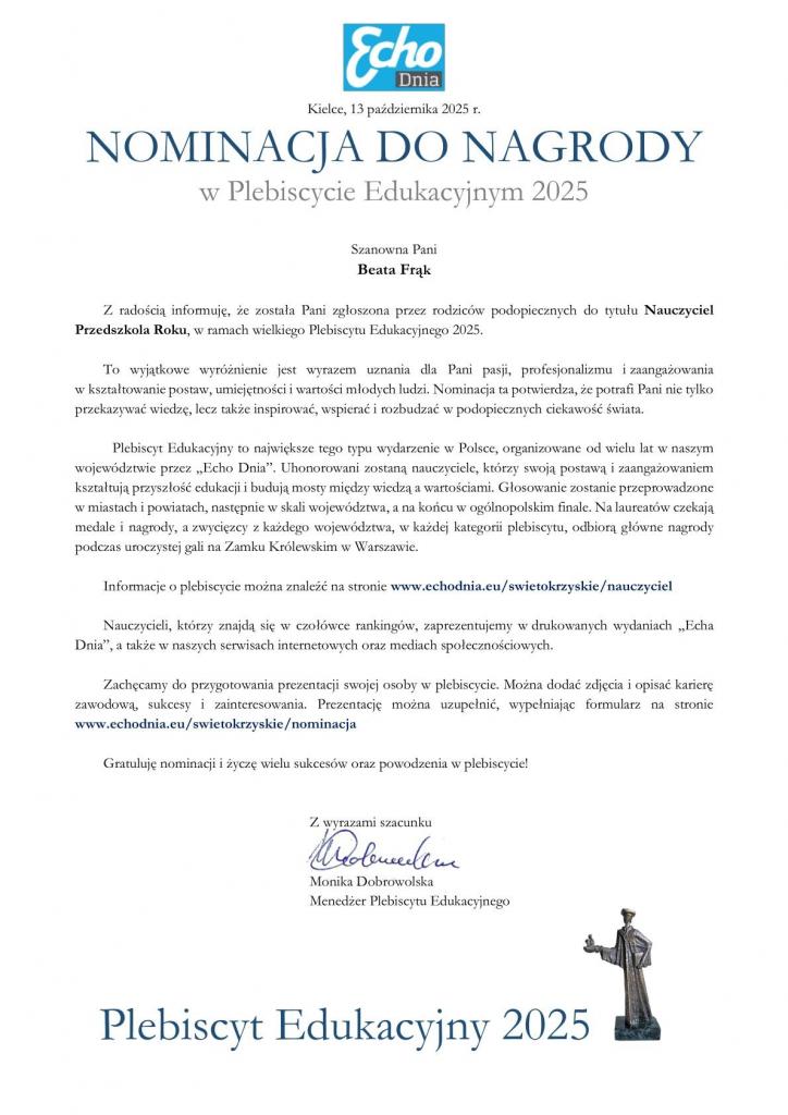 Z ogromną radością i wdzięcznością przyjęliśmy wiadomość o nominacji Naszego Przedszkola do tytułu "Przedszkole Roku 2025" w Plebiscycie Edukacyjnym 2025 zorganizowanym przez "Echo Dnia". Dziękujemy również za nominację w kategorii Dyrektor Przedszkola- pani Anna Waszkiewicz, Nauczyciel Przedszkola - pani Beata Frąk oraz Psycholog - pani Weronika Maruszak.