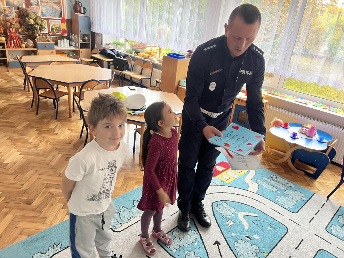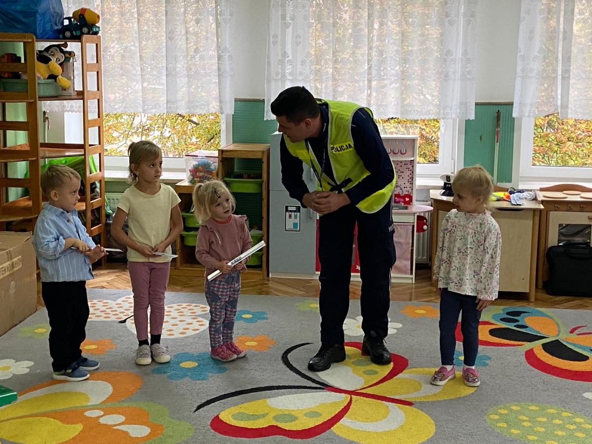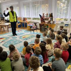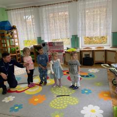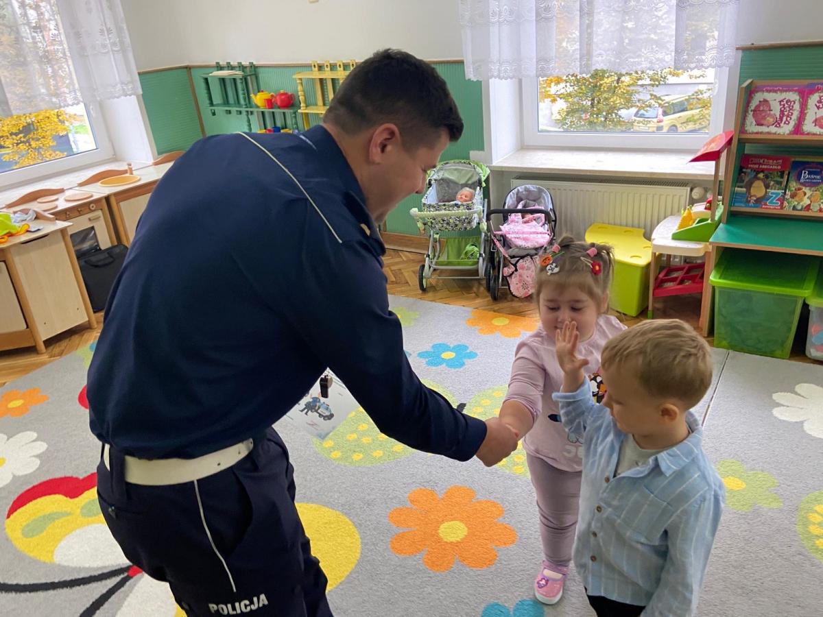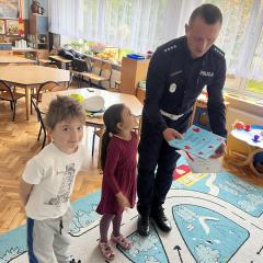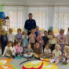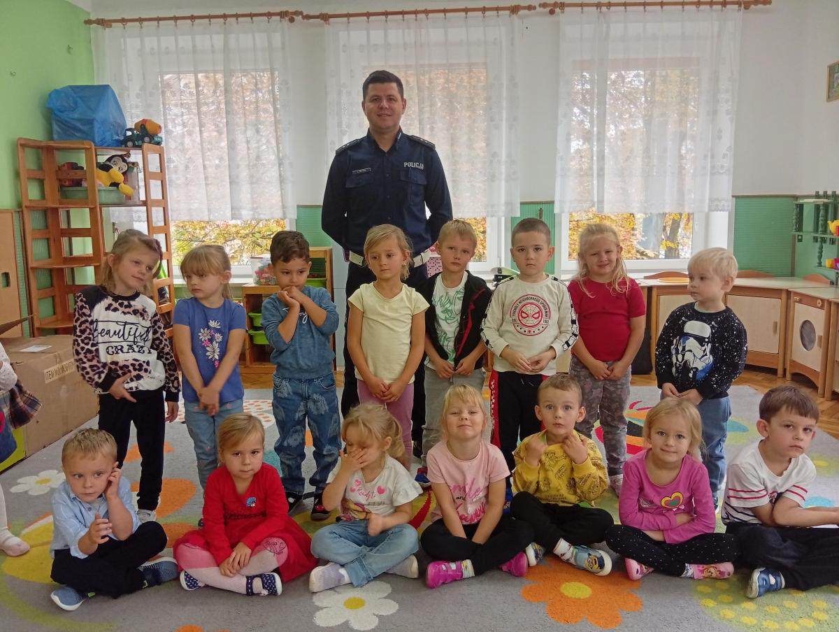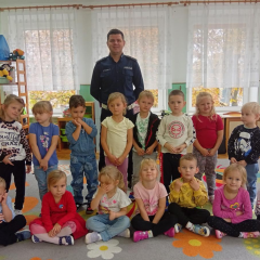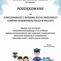 14 października dzieci z naszego przedszkola wzięły udział w zajęciach edukacyjnych prowadzonych przez funkcjonariuszy policji z WRD KWP w Kielcach. W trakcie spotkania poruszane były tematy codziennej pracy policji, bezpieczeństwa w ruchu drogowym oraz sposobów zachowania w sytuacjach zagrożenia. Na zakończenie spotkania dzieci wręczyły samodzielnie wykonane laurki i dyplomy z podziękowaniami.