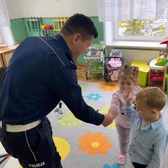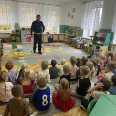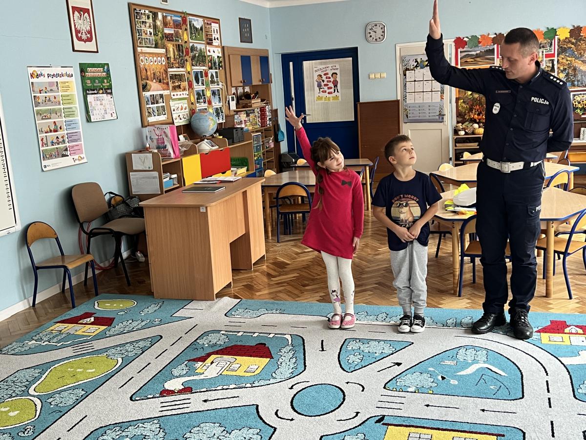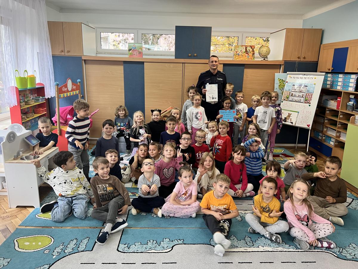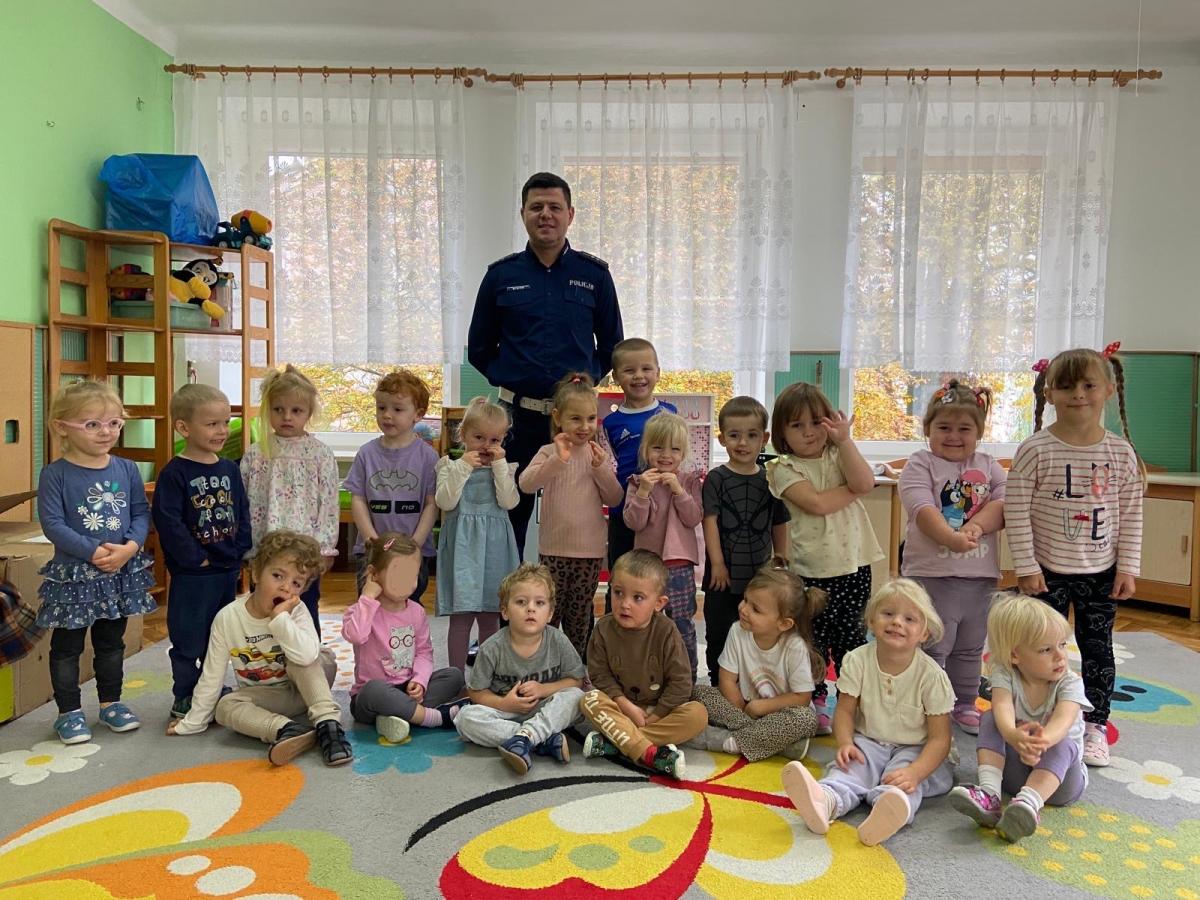 14 października dzieci z naszego przedszkola wzięły udział w zajęciach edukacyjnych prowadzonych przez funkcjonariuszy policji z WRD KWP w Kielcach. W trakcie spotkania poruszane były tematy codziennej pracy policji, bezpieczeństwa w ruchu drogowym oraz sposobów zachowania w sytuacjach zagrożenia. Na zakończenie spotkania dzieci wręczyły samodzielnie wykonane laurki i dyplomy z podziękowaniami.