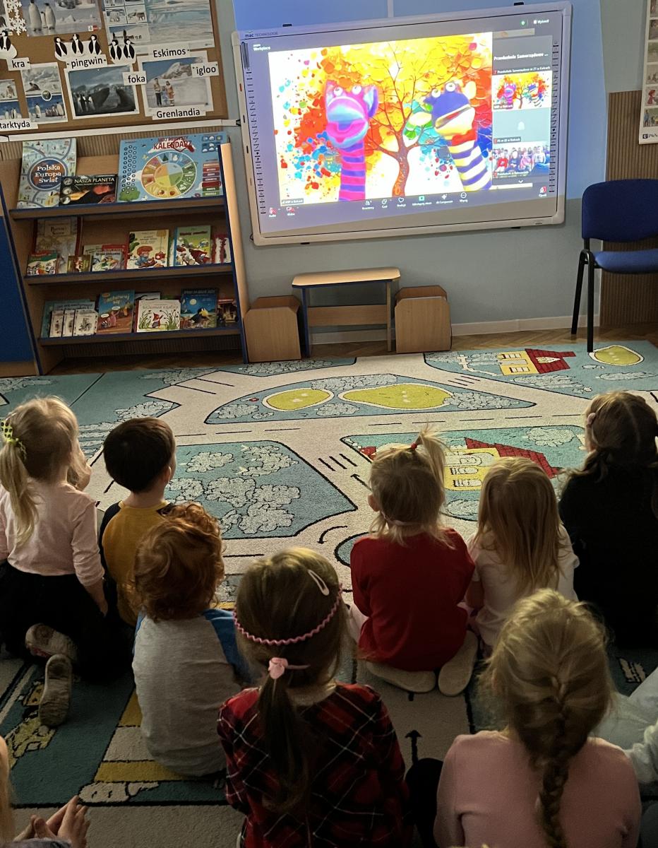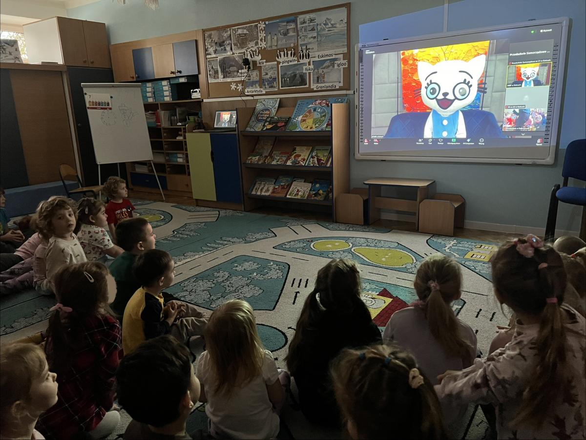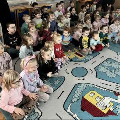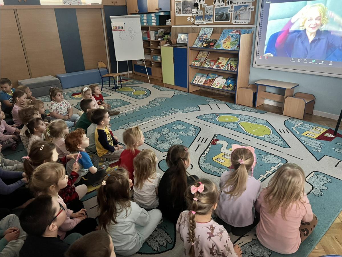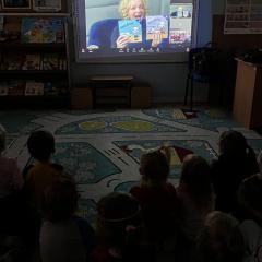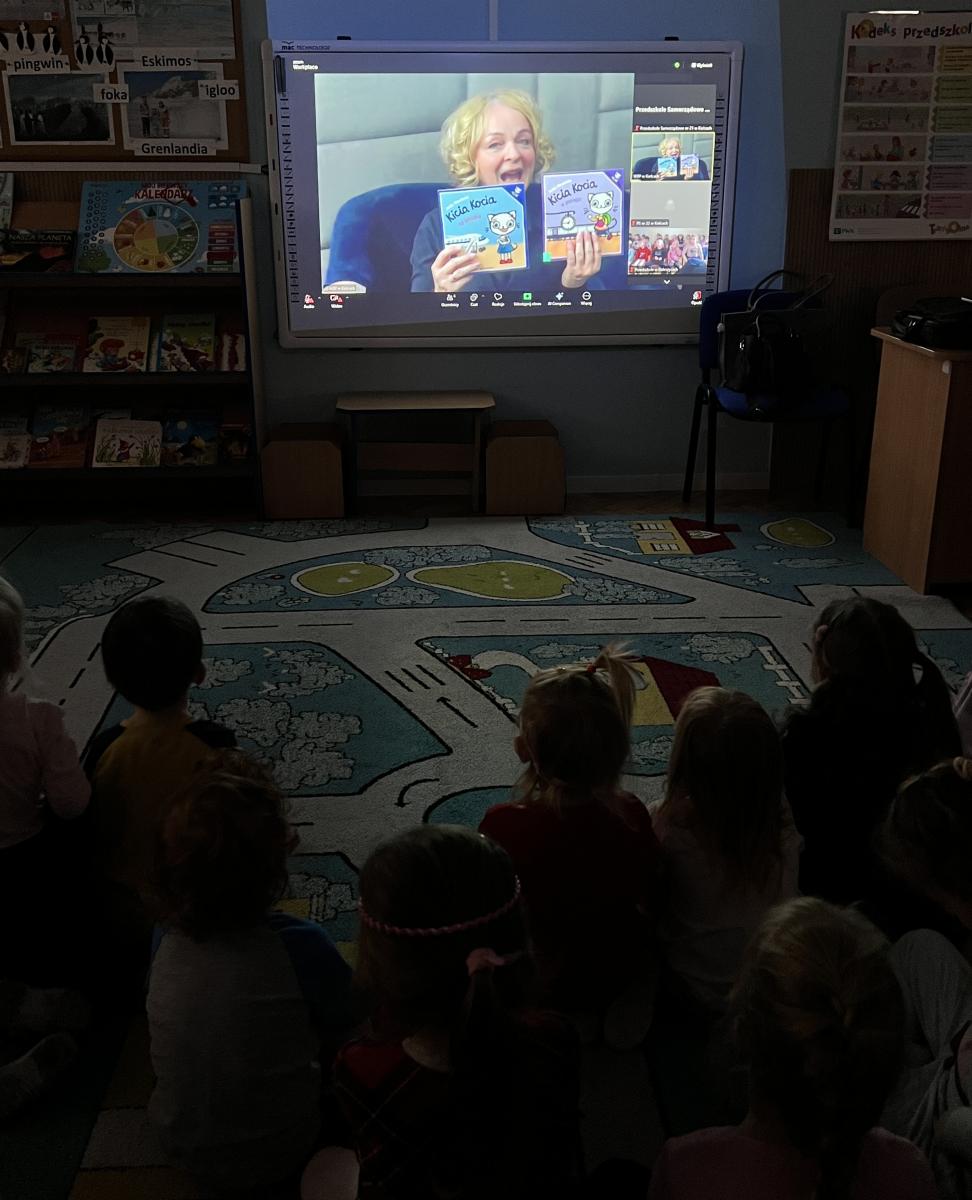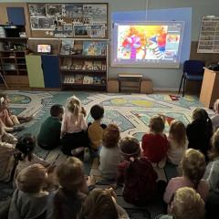 Przedszkolaki wzięły udział w wirtualnym spotkaniu z Kicią Kocią w ramach akcji „Bibliusiowe czytanki na wesołe poranki” zorganizowanej przez Wojewódzką Bibliotekę Publiczną im. Witolda Gombrowicza w Kielcach. Pacynki - Bibliuś i Woluminka, zabrały dzieci w czytelniczą wyprawę, prezentując książki: „Kicia Kocia na lotnisku” oraz „Kicia Kocia w pociągu”.